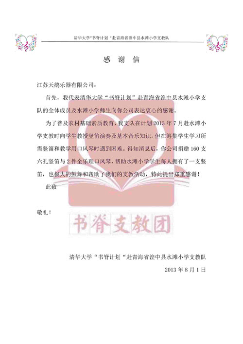 2013年7月,為了普及農村基礎素質(zhì)教育,清華大學(xué)“書(shū)脊計劃“支教隊赴青海省湟中縣湟中縣水灘小學(xué)支教 ,向學(xué)生教授豎笛演奏及基本音樂(lè )知識。我公司也向水灘小學(xué)捐贈了口風(fēng)琴和豎笛來(lái)配合這項計劃,以示支持。