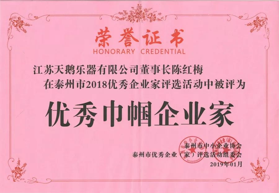 江蘇天鵝樂(lè )器有限公司董事長(cháng)陳紅梅在泰州市2018優(yōu)秀企業(yè)家評選活動(dòng)中被評為“優(yōu)秀巾幗企業(yè)家”。