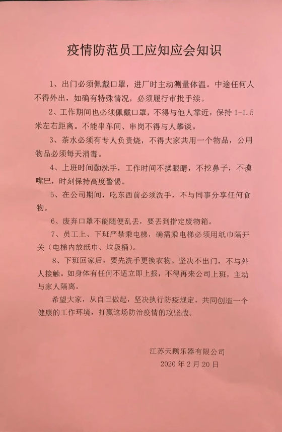 當前,疫情防控工作形勢依然嚴峻復雜,疫情防控仍是當前重要的工作,貫徹外防輸入、內防擴散的方針,堅定信心、同舟共濟、科學(xué)防治、精準施策。天鵝樂(lè )器選擇了2020.02.20這個(gè)特殊的日子開(kāi)工,是出于對生命的尊重和員工的愛(ài)護,錢(qián)可以慢慢賺,但生命只有一次,員工的健康平安比什么都重要!