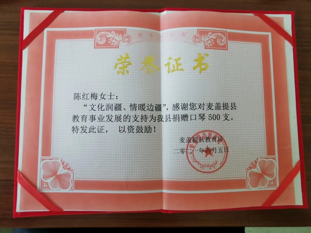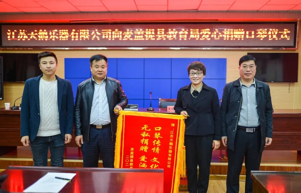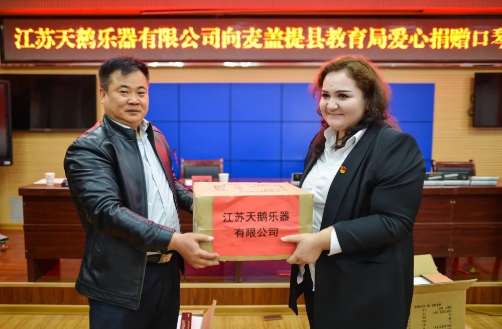 人們常說(shuō)“社會(huì )多一份關(guān)愛(ài),孩子就多一份信心,我們的未來(lái)就多一份希望”。新疆位于我國西部邊陲,天鵝樂(lè )器非常關(guān)心新疆、特別是南疆的教育事業(yè)的發(fā)展,現委托山東援疆劉洋老師向麥蓋提縣教育局捐贈口琴500把,用于音樂(lè )課堂或社團教學(xué)。