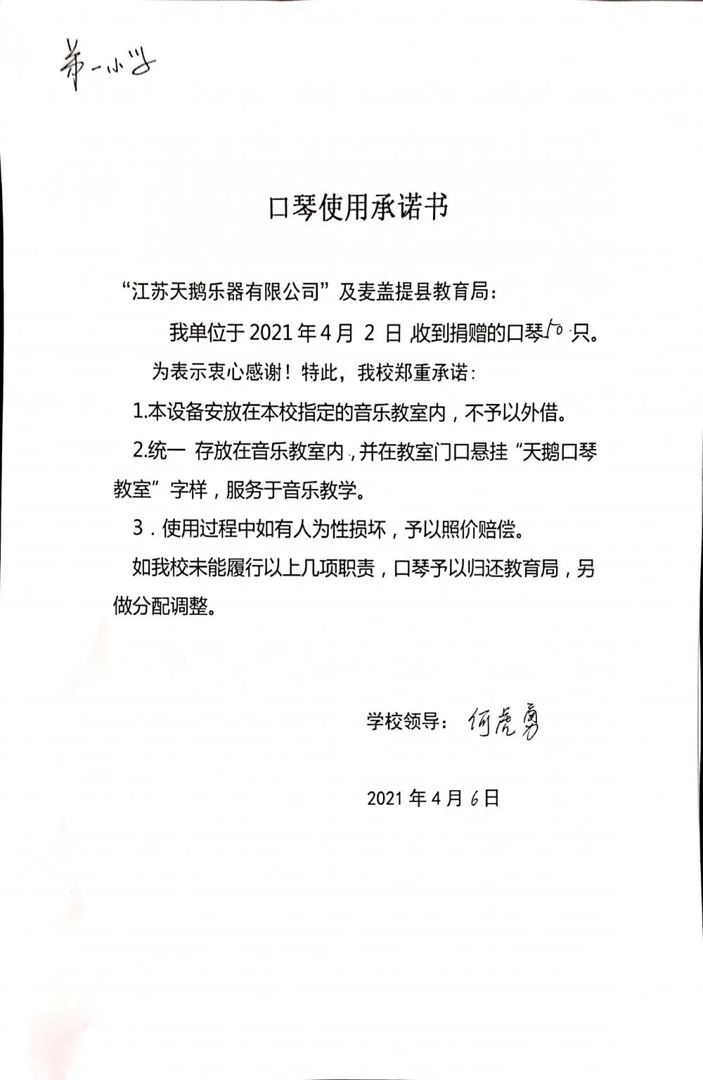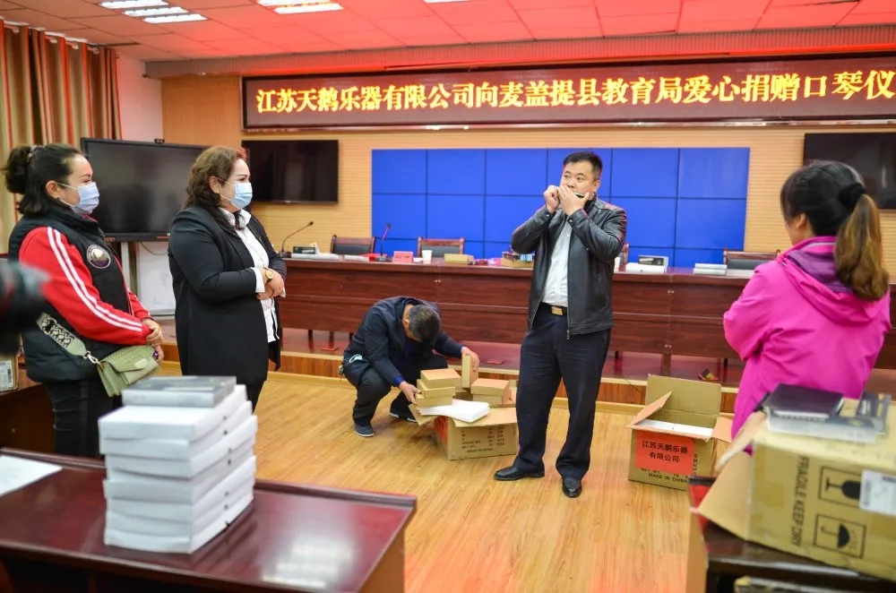 希望能通過(guò)今天的愛(ài)心口琴捐贈儀式與貴公司架起音樂(lè )之橋、友誼之橋,能夠讓我們的孩子通過(guò)口琴這一樂(lè )器將麥蓋提的聲音及維吾爾文化傳出新疆傳向全國!同時(shí),我們更熱忱歡迎江蘇天鵝樂(lè )器有限公司的各位領(lǐng)導及社會(huì )各界有識之士來(lái)麥蓋提觀(guān)光旅游、捐資助教、參與開(kāi)發(fā)建設,讓我們一起攜手辦好教育,為黨育人、為國育才。