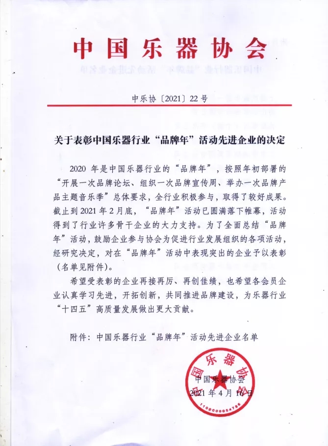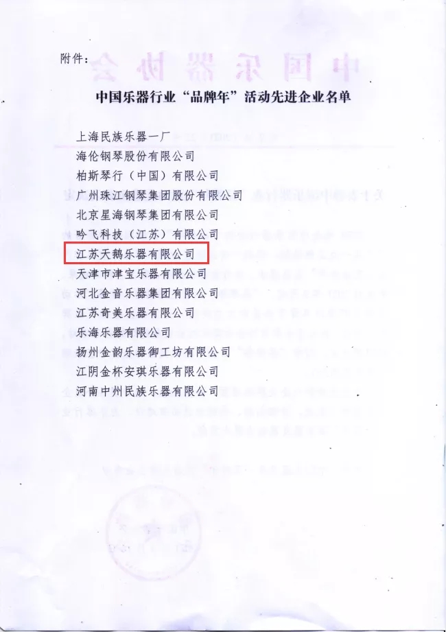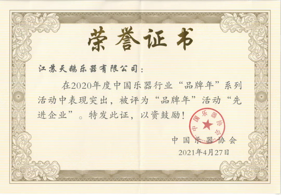 4月27日下午,在中國樂(lè )器協(xié)會(huì )八屆二次理事(擴大)會(huì )議暨八屆二次常務(wù)理事會(huì )議上,天鵝樂(lè )器獲得中國樂(lè )器行業(yè)“品牌年”活動(dòng)“先進(jìn)企業(yè)”榮譽(yù)。