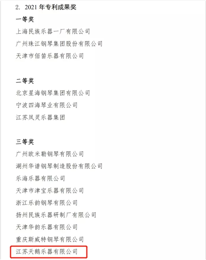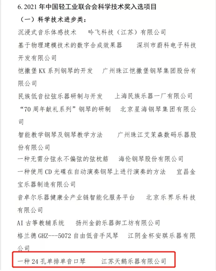 2021年是中國樂(lè )器協(xié)會(huì )的“科技創(chuàng )新年”,表彰決定上天鵝樂(lè )器有限公司再傳捷報。天鵝樂(lè )器的“24孔單孔單音口琴”獲得“2021年度《升級和創(chuàng )新消費品 輕工(第八批)》升級消費品”、“2021年中國輕工聯(lián)合會(huì )科學(xué)技術(shù)進(jìn)步獎”、“2021年專(zhuān)利成果獎三等獎”和“2021年度中國樂(lè )器行業(yè)科技創(chuàng )新活動(dòng)組織獎”等殊榮。