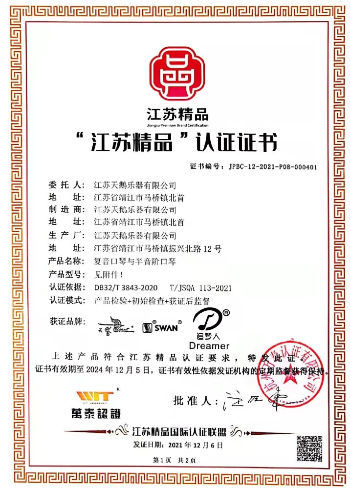 近日,江蘇天鵝樂(lè )器有限公司通過(guò)了2021年“江蘇精品”的認證,預示著(zhù)企業(yè)朝著(zhù)精品行業(yè)邁進(jìn)了一大步。